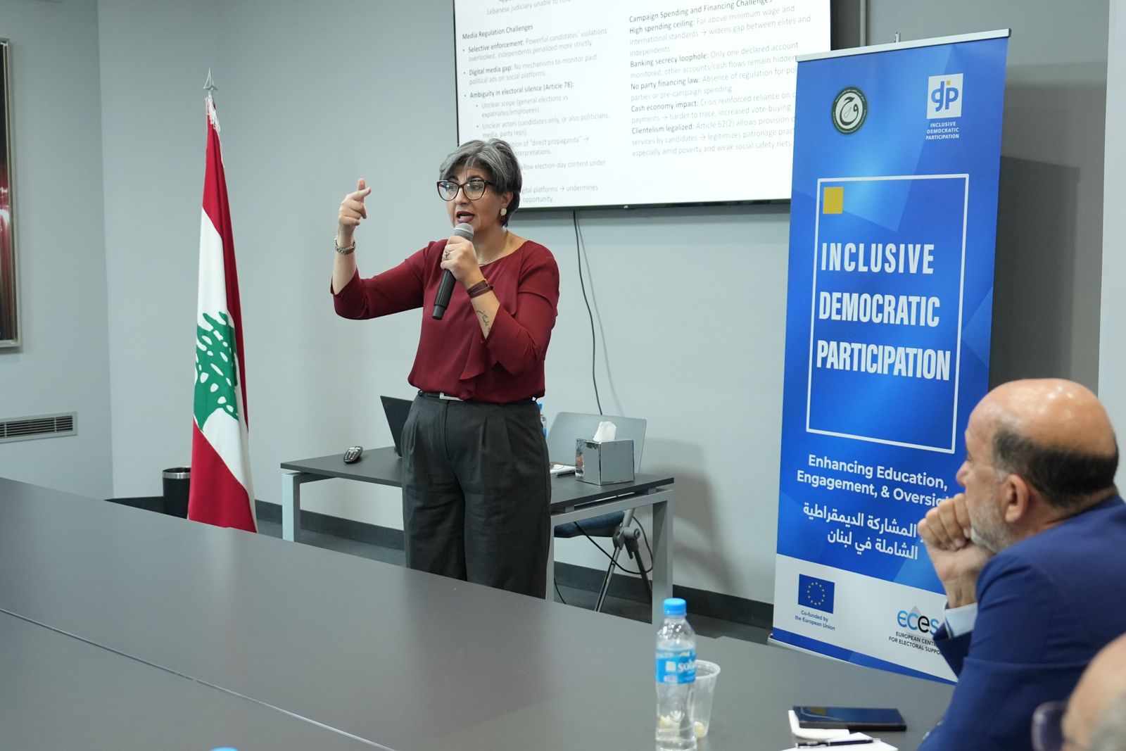 افتُتحت الجلسة بكلمة ترحيبية، تلتها مداخلة قدّمت خلالها مديرة المشروع السيدة رولا زيات عرضًا لأهداف ومحاور العمل الأساسية للمشروع. واستعرض الدكتور عصام سليمان، المستشار الرئيسي للمشروع والرئيس السابق للمجلس الدستوري، الإشكالات التي يثيرها الإعلام والإعلان الانتخابي في لبنان، متوقفًا عند التحديات التي تعيق تطبيق القوانين والأنظمة ذات الصلة استنادًا إلى التجارب السابقة.